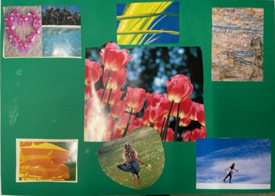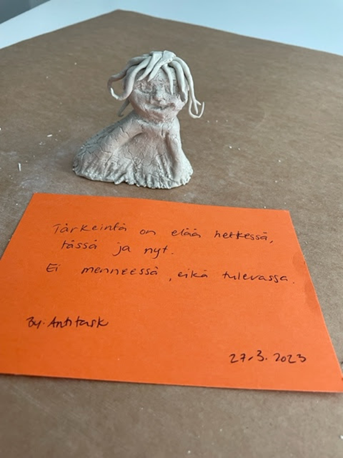 ”Aluksi luulin ettei tule mitään. Kun vaan alkoi tehdä intuitiolla oli ihan kivaa…opin, että on yllättävää, mitä siltä tulee ….kaiken luovan kautta voi purkaa asioita…ei paineita, kun ei ole vaatimuksia (=kuvataidetehtävän toteuttamiselle)…” Asiakas 27.3.2023.